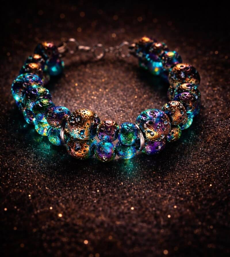 A bold expression of light within darkness, this double-strand bracelet features iridescent lava-style beads in shifting tones of deep blue, emerald green, violet, and warm gold.