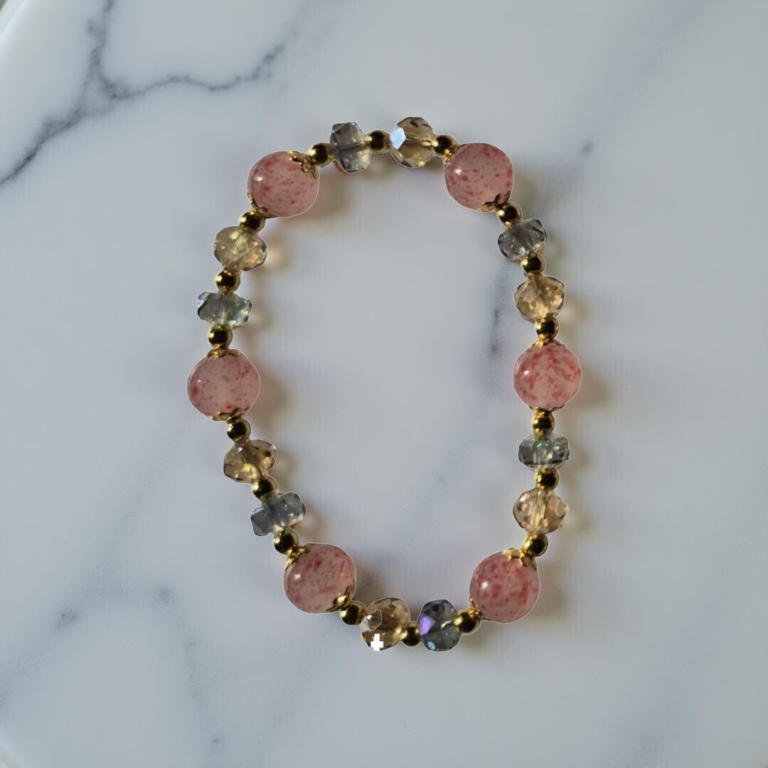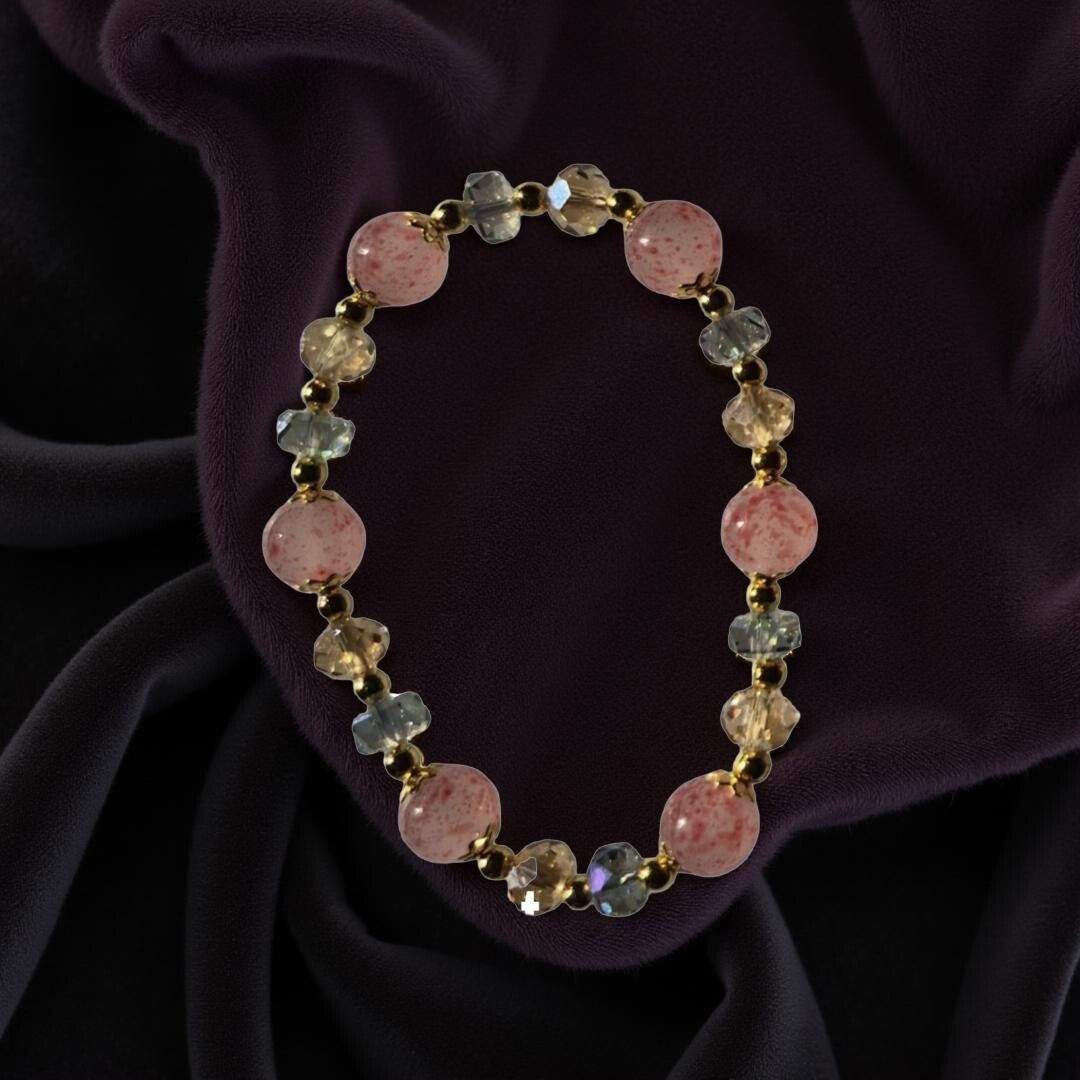 This beauty is made of pink crystal beads and complemented with smaller ones also crystals. It is elegant for a formal or casual outfit. It can be layered with other bracelets