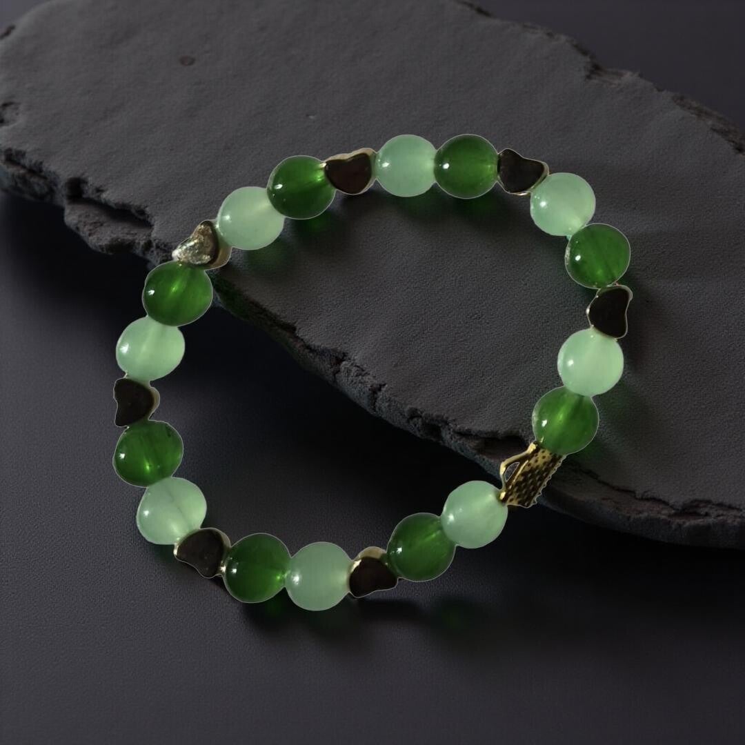 Two different greens glass beads that complement each other with golden heart spacers. From the heart collection.