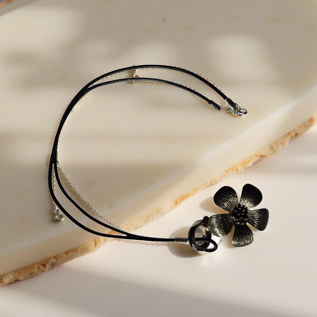 Fine metal flower and silvery ring for contrast. Black cord, lightweight.