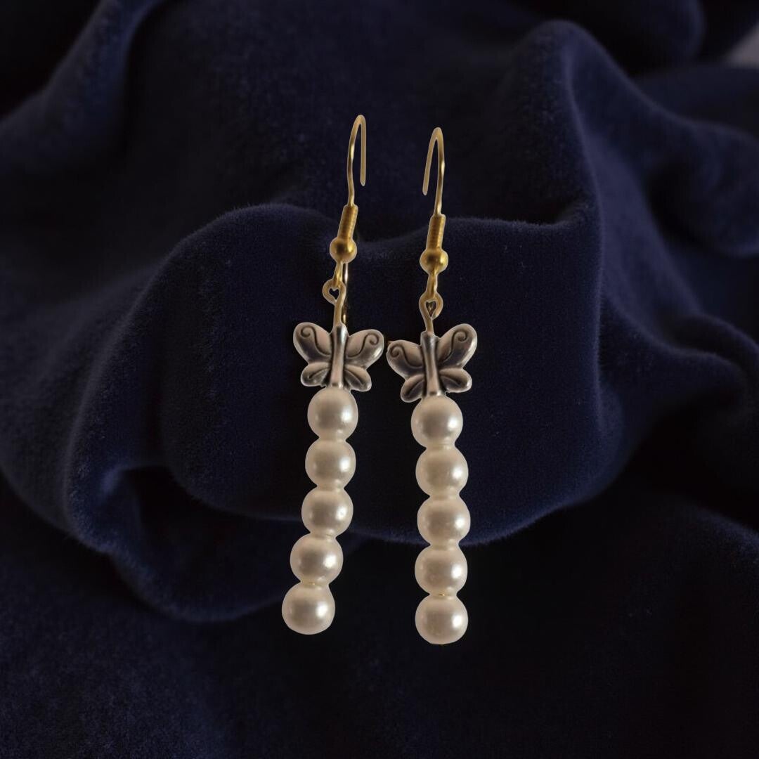 Elegant and graceful, these drop earrings feature delicate pearl-toned beads paired with soft golden accents beneath a charming silver butterfly. The gentle shimmer of the beads adds a refined glow, creating a timeless design that feels both feminine and sophisticated. Perfect for adding a subtle touch of elegance to any look.