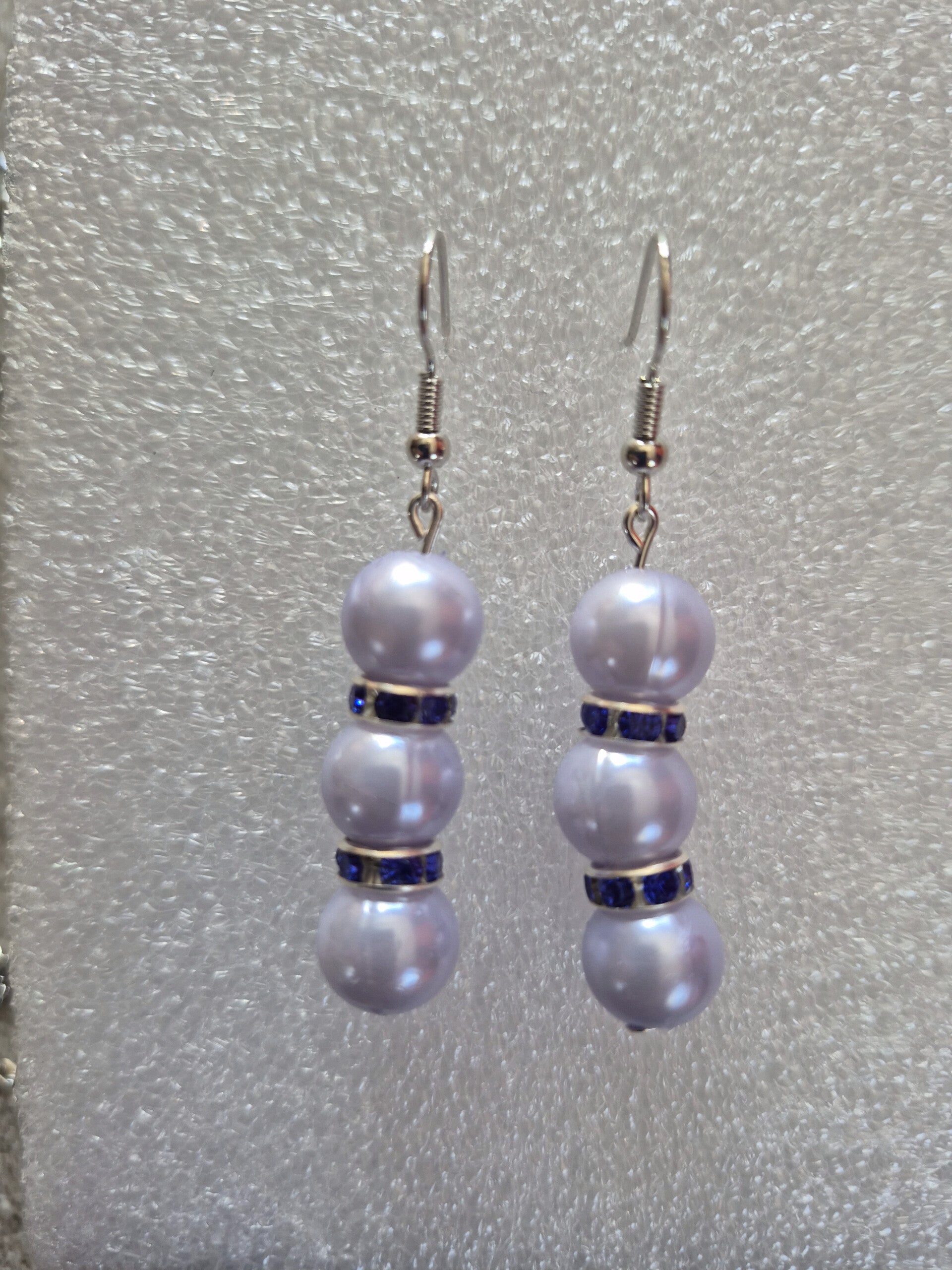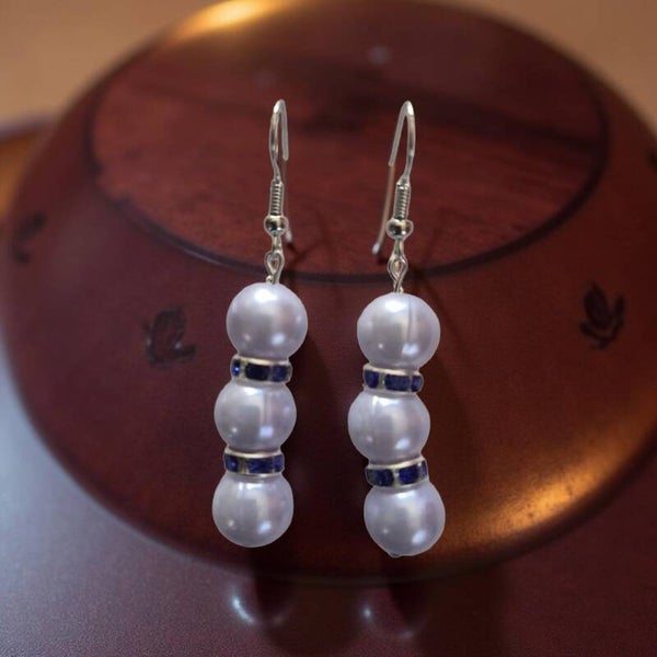 Timeless and refined, these drop earrings feature luminous pearl-tone beads accented with deep blue crystal spacers. The soft glow of the pearls paired with the rich blue detail creates an elegant contrast, perfect for adding classic sophistication to both day and evening wear.