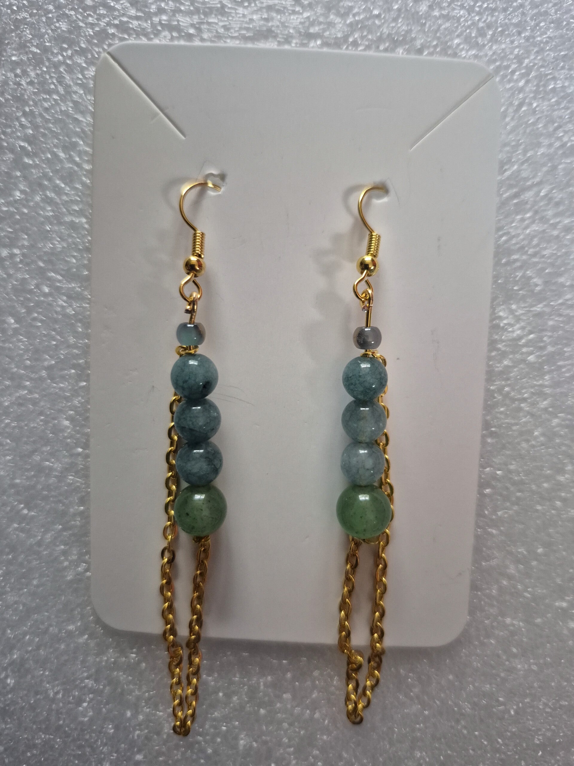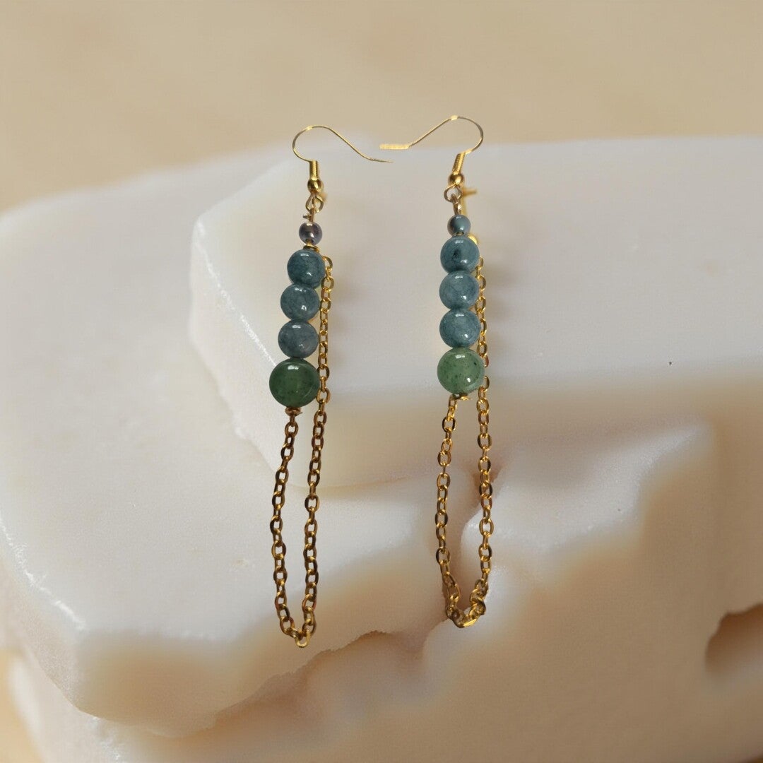 Elegant and refined, these handcrafted drop earrings feature soft green-toned gemstone beads accented with delicate gold chain details. The gentle movement of the chain adds a graceful flow, while the natural hues create a fresh, earthy feel. A timeless piece designed to elevate both everyday and special occasion looks.
