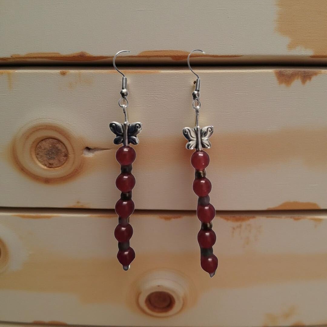 Delicate and feminine, these handcrafted earrings feature soft red beads cascading in a graceful line beneath a charming silver butterfly. The warm tones of the beads beautifully complement the detailed butterfly charm, creating an elegant drop design that moves gently with you. Perfect for adding a touch of romance and subtle colour to any outfit.
