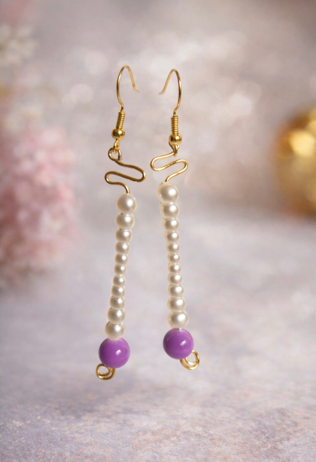 Delicate drop earrings featuring a graceful row of luminous white pearls finished with a vibrant purple bead accent. Set on gold-tone hooks with soft curved detailing, they offer a refined blend of classic elegance and playful colour.