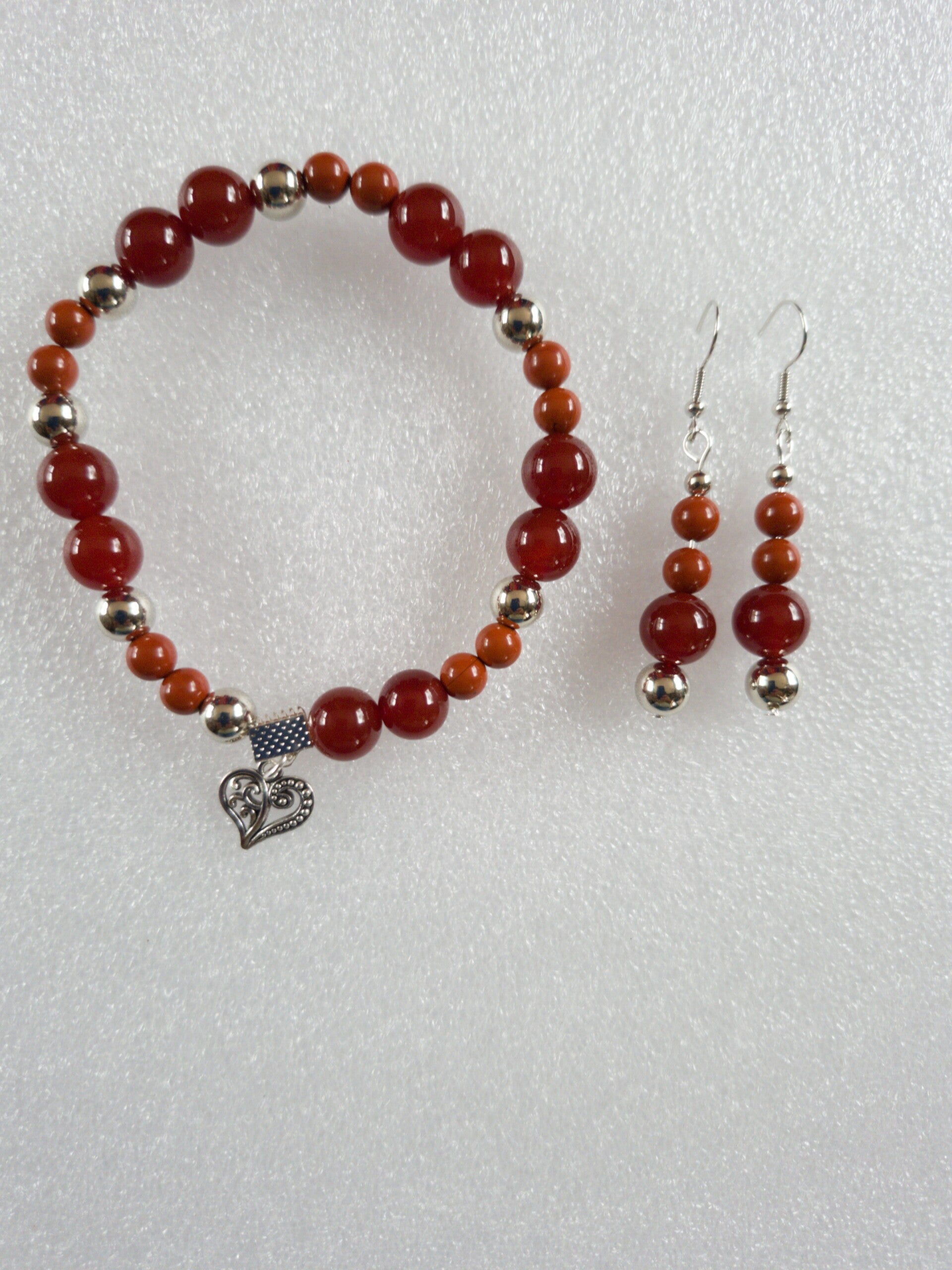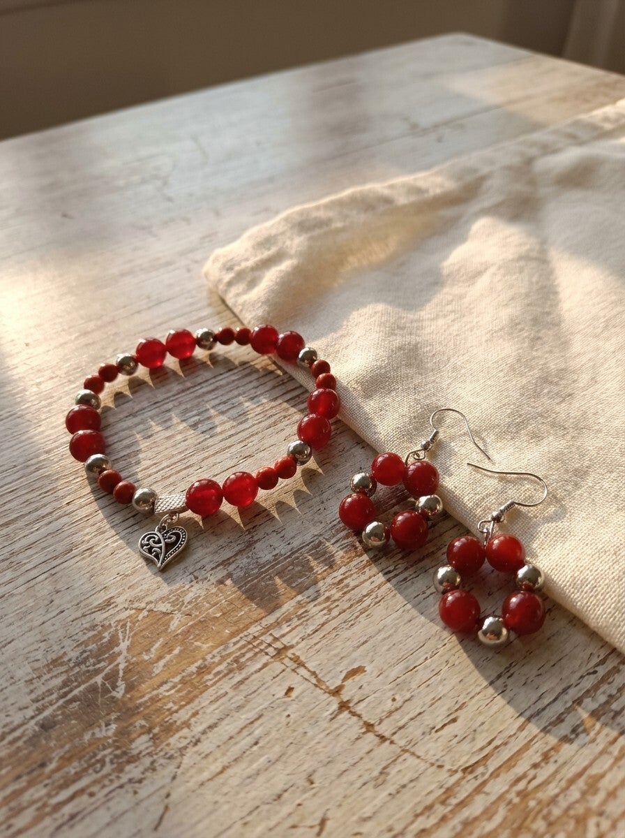This charming jewellery set includes a stretch bracelet and matching drop earrings, crafted with glossy red beads and accented with polished silver-tone spacers.