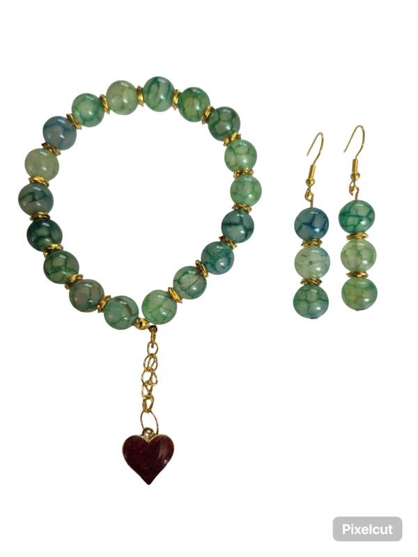 This beautiful handmade set features a bracelet and matching earrings made with green crackle glass beads, each one displaying unique patterns and depth. Gold-tone spacers add a touch of elegance, while the bracelet is finished with a dangling red heart pendant for a romantic accent.
