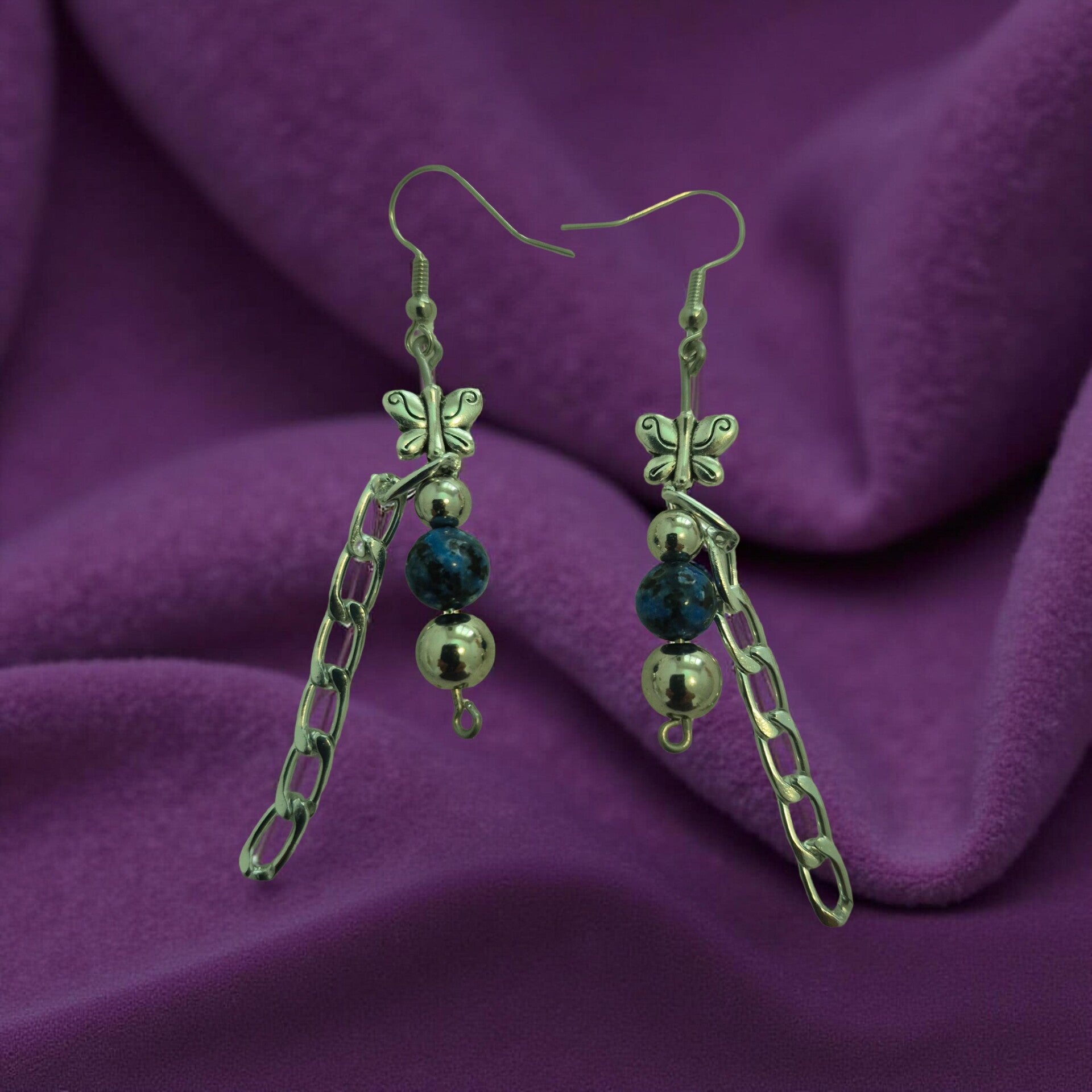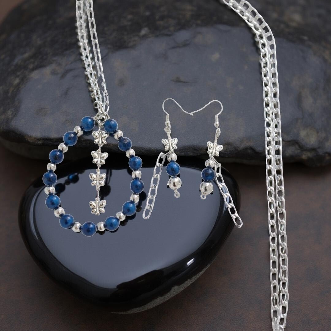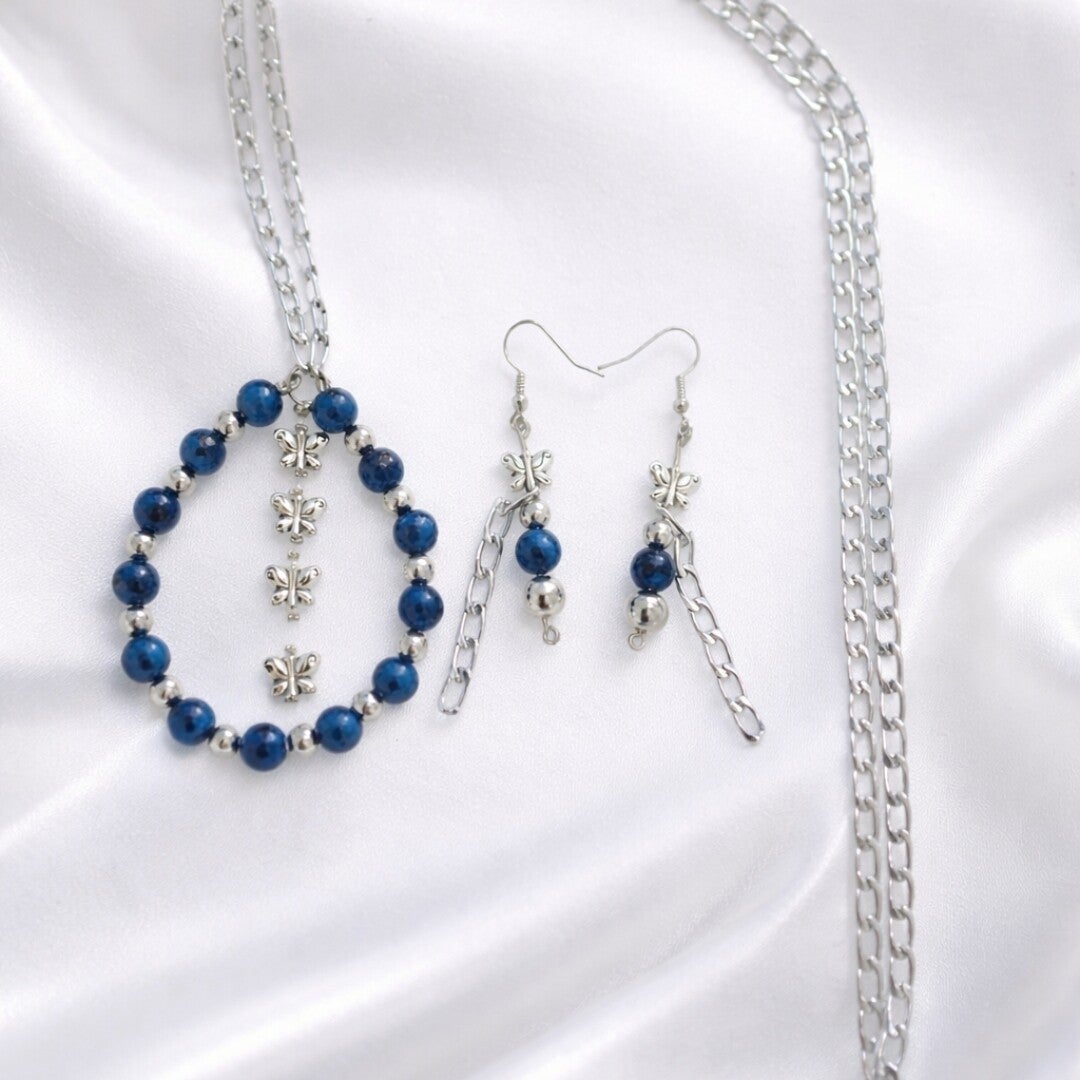 Beautiful and delicated set, made of blue sesame Jasper dyed beads. Embellished with silver spacers and butterflies suspended in the air.