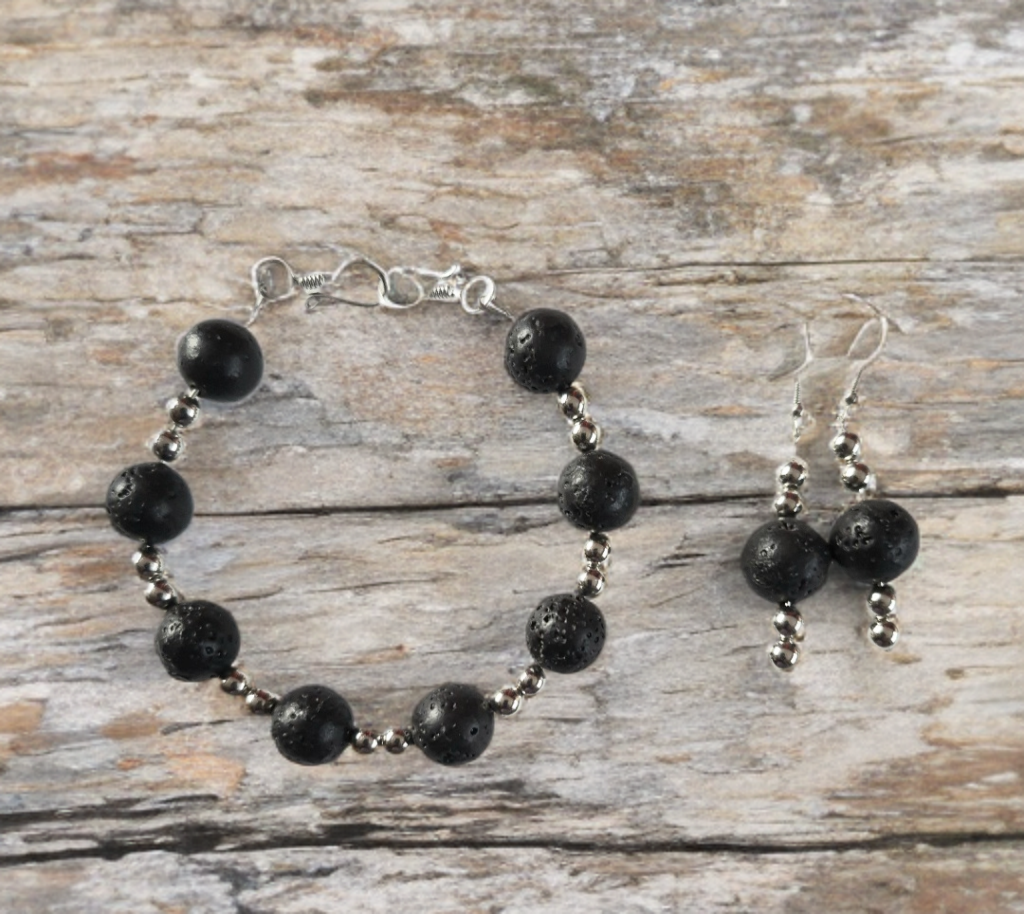 This set is made of volcanic (lava) beads and silver round spacers for embellishments. It can be wearing as a normal bracelet.or because the pouros surface allows to embedded essential oil you can then have an aromatherapy bracelete.