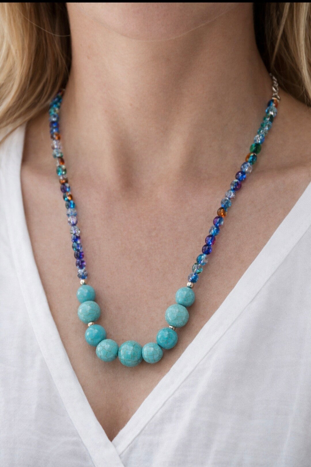 This handmade necklace features a beautiful combination of smooth turquoise-coloured beads and delicate multicoloured glass beads, creating a vibrant yet harmonious design. The larger turquoise beads at the centre add a bolc focal point, while the smaller translucent beads reflect light in soft shades of blue, purple, green and amber