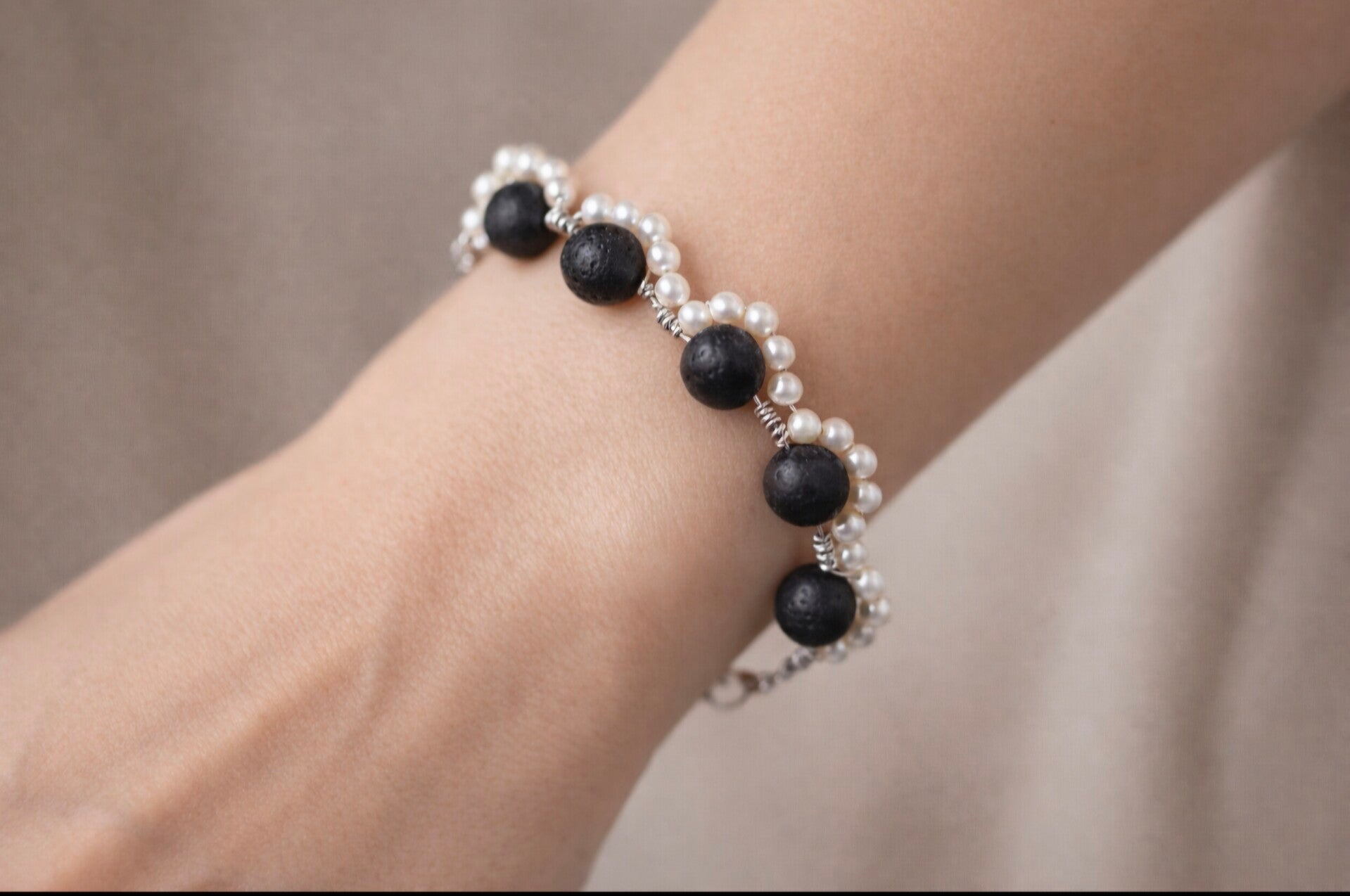 Handcrafted with natural volcanic stone beads, this bracelet features a unique porous texture and an organic, earthy look. The lava stones are ideal for aromatherapy, allowing essential oils to be absorbed and gently diffused throughout the day. Lightweight and comfortable, it is finished with soft pearls beads for a modern touch and effortless everyday wear.