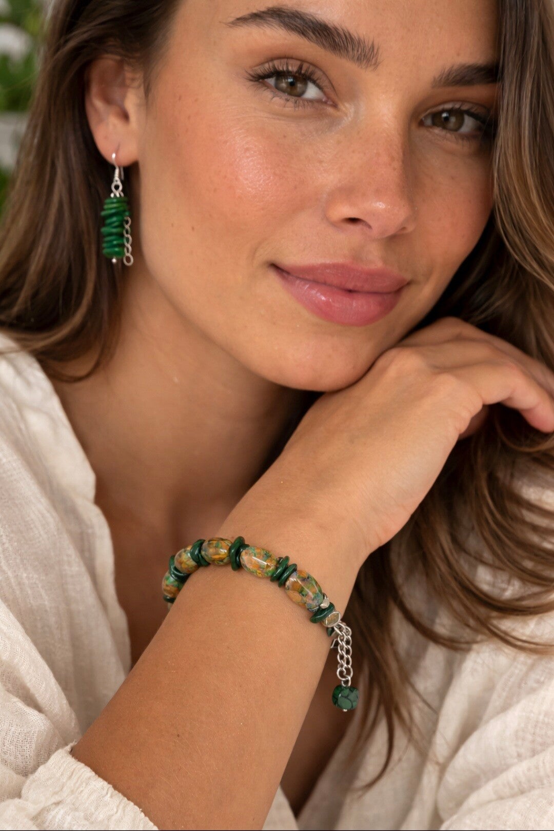 The bracelet is crafted with marbled green and earthy-toned beads accented by natural green stone chips and finished with a delicate silver chain and charm.