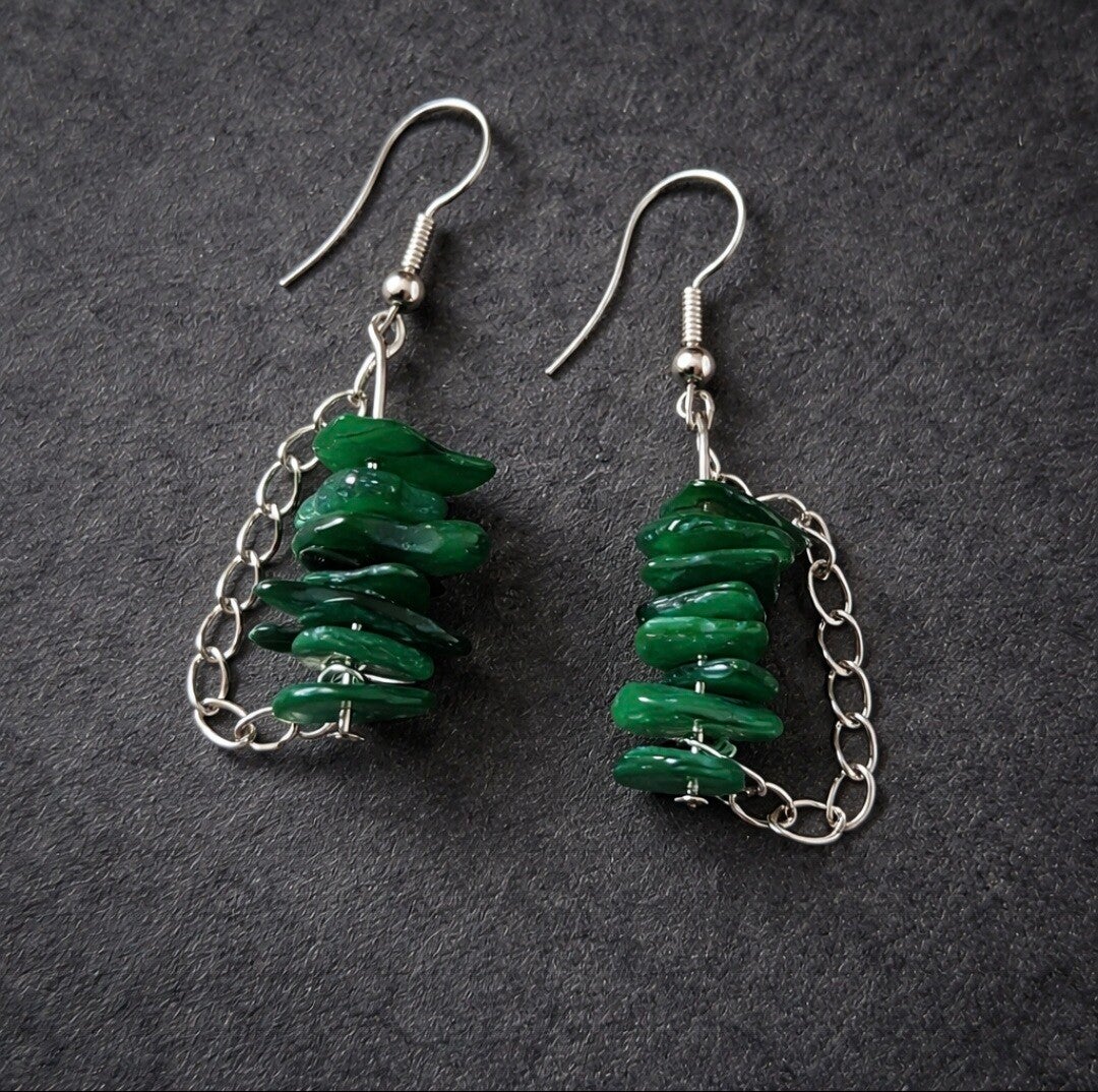 To personalise the set, you can choose two pairs of earrings out of three available designs. One pair echoes the bracelet’s warm green and amber tones, another showcases stacked deep-green stones, and a third option features a similar elegant style without the silver chain for a simpler look.